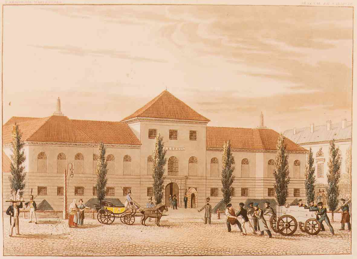 | J.Piwarski, "Zbrojownia warszawska", litografia kolorowana 1829 r. wł. Państwowe Muzeum Archeologiczne |