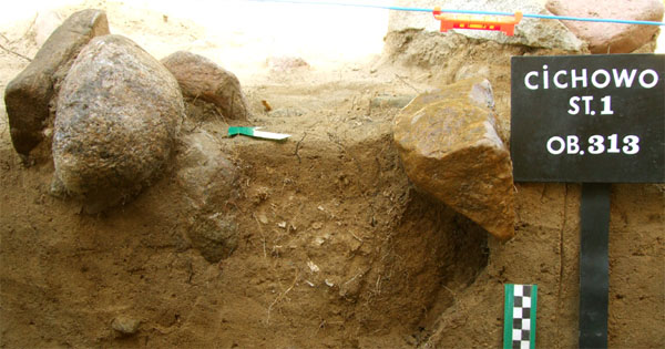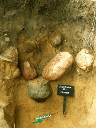 Wykop na południowym zachodzie cmentarzyska. Obok pozostałości bruku