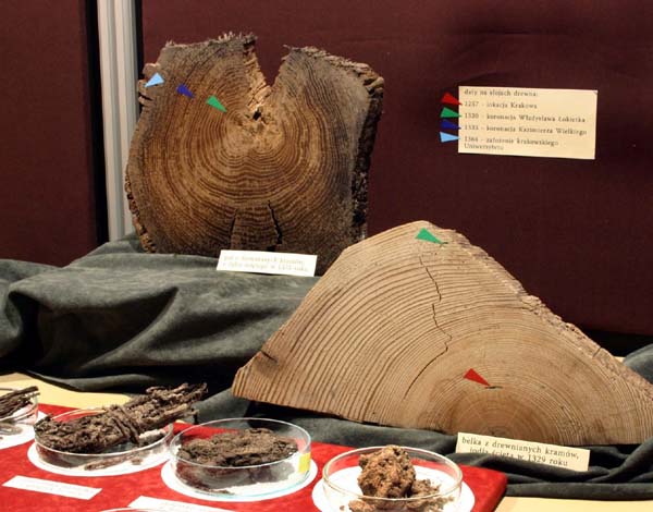 Natrafiono na warstwy gliniaste z późnego średniowiecza, zawierające bogaty materiał organiczny taki jak: nasiona, owoce, pyłki roślinne, gałązki i fragmenty pni drzew. Odkryto podwaliny i fragmenty drewnianych kramów z XIV wieku, ciągnących się równolegle wzdłuż północnej części Sukiennic. Odsłonięto pozostałości budynków drewnianych pomiędzy którymi znajdowała się wąska uliczka. Badania dendrologiczne udowodniły, że budowle te wzniesiono z belek ściętych w latach 1299 - 1309 r. Budynki funkcjonowały do XV wieku następnie na ich miejscu zbudowano kramy, użytkowane do XIX wieku. |