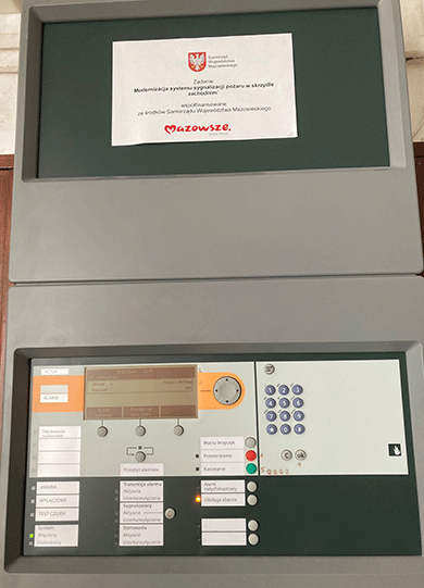 Inwestycja została sfinansowana z dotacji celowej z budżetu Województwa Mazowieckiego przeznaczonej na zadanie pt.: „Modernizacja systemu sygnalizacji pożaru w skrzydle zachodnim”,